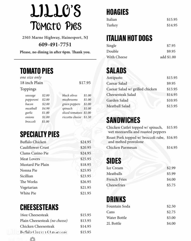 Welcome to the vibrant world of Lillo's Tomato Pies, a delightful haven nestled at 2503 Marne Hwy, Hainesport, NJ. This casual eatery is where comfort food reigns supreme, specializing in burgers, pizzas, and scrumptious sandwiches that make every visit a memorable experience.